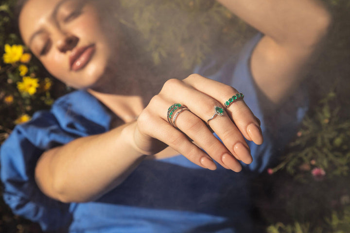 "Fusionando el brillo impecable del oro blanco 18K con el verde vibrante de cinco esmeraldas en corte redondo. Inspirado en la armonía y el equilibrio, el número cinco simboliza el cambio positivo y la libertad interior. Cada esmeralda, con su intenso resplandor, resalta la conexión con la naturaleza y la fuerza interior. "