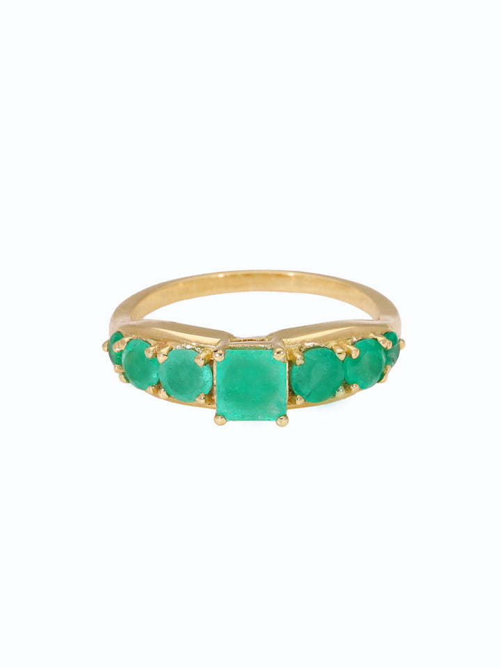 "Este anillo en oro 18k con una esmeralda cuadrada y seis esmeraldas redondas simboliza la unión entre estructura y fluidez. La piedra central representa la claridad y el enfoque, mientras las seis laterales evocan armonía, belleza y equilibrio emocional. Una pieza que recuerda que la fuerza verdadera nace de un corazón estable y un espíritu en expansión."