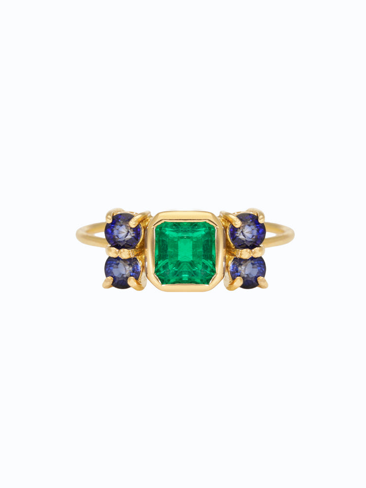 "Anillo en oro 18K que une la energía de la esmeralda y la fuerza de los zafiros, simbolizando el equilibrio entre el sentir y el pensar. La esmeralda representa sanación y verdad interior, mientras cuatro zafiros evocan estabilidad y claridad. Una joya de autor hecha a mano en Colombia, creada para quienes buscan armonía y propósito."