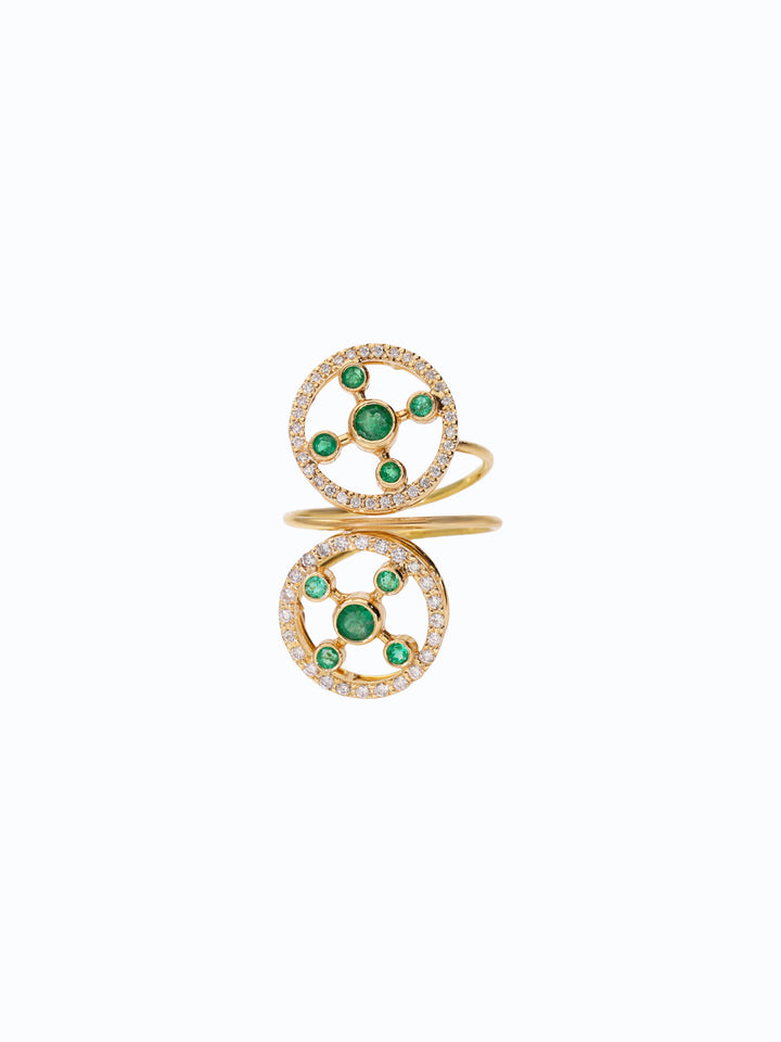 "Este anillo de diseño cruzado con 5 esmeraldas y 28 diamantes es un talismán de protección y expansión espiritual. Las 5 esmeraldas representan libertad, transformación y el poder del corazón para guiar el camino, mientras los 28 diamantes evocan plenitud y prosperidad. Una pieza que recuerda que cuando la luz y la firmeza se entrelazan, todo destino se abre con claridad."