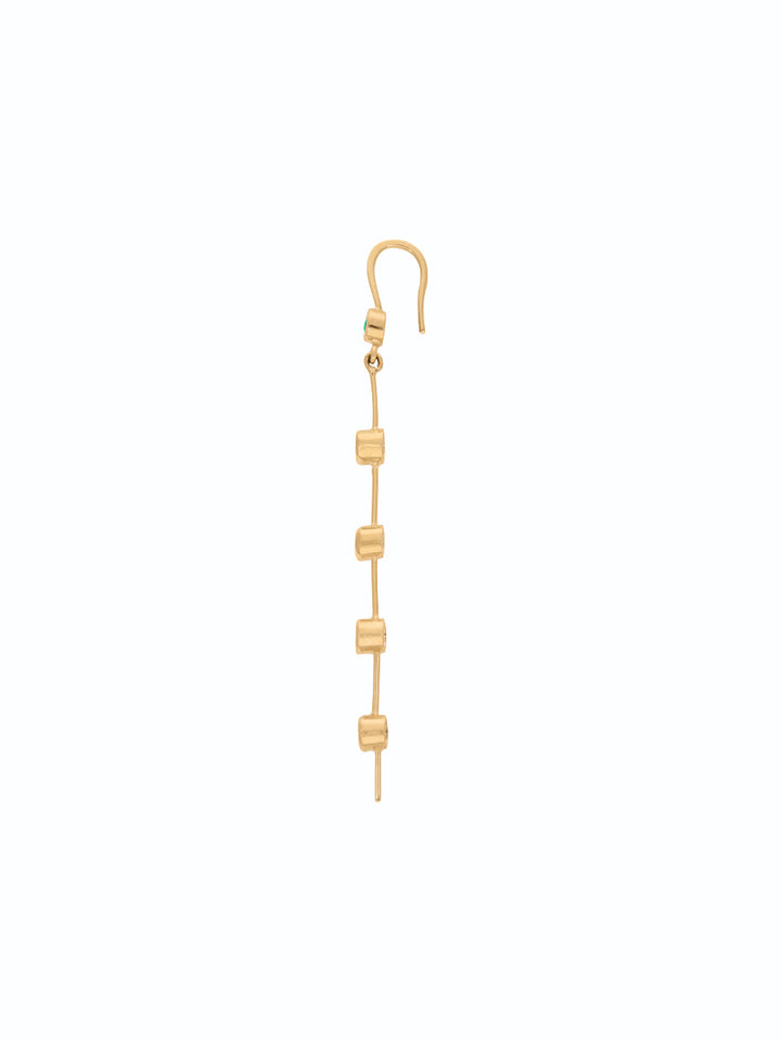 "Este arete con 5 esmeraldas es un símbolo de alineación y evolución interior. El número 5 representa libertad, expansión y movimiento consciente, invitando a abrazar los cambios con valentía. Cada esmeralda vibra con la energía del corazón, recordando que toda transformación florece desde el amor propio. Una pieza que acompaña procesos de crecimiento y renacimiento."