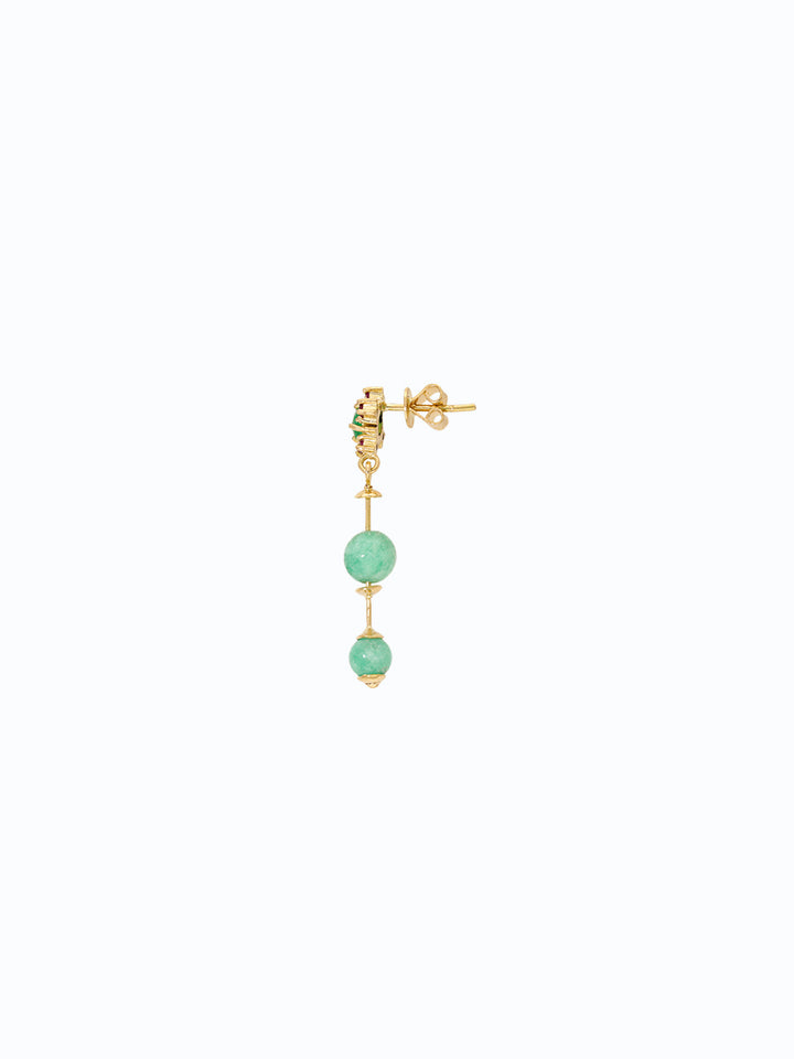 "Aretes inspirados en la dualidad entre el corazón y la mente, donde la serenidad de la esmeralda se encuentra con la fuerza vibrante del rubí, la esmeralda simboliza equilibrio y renovación; el rubí, pasión y poder interior. Su diseño vertical en oro evoca el número 3, energía de expansión y armonía entre cuerpo, mente y espíritu."