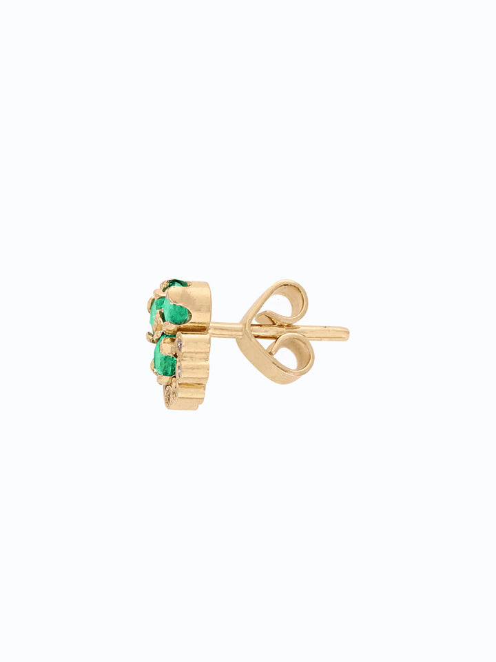 "Estos aretes en oro 18k reúnen tres esmeraldas que simbolizan la trilogía sagrada del ser mente, cuerpo y espíritu, vibrando desde el centro con la energía del amor consciente y la renovación interior. Un halo de seis diamantes representa la armonía y el equilibrio del número 6, asociado con la protección, la belleza y la manifestación del propósito."