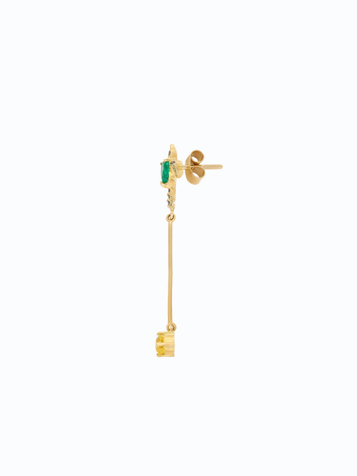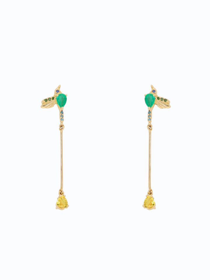 "Aretes en oro 18k inspirados en el colibrí, símbolo de libertad y ligereza, con esmeralda en gota y destellos de diamantes azules y verdes que ofrecen claridad y protección.