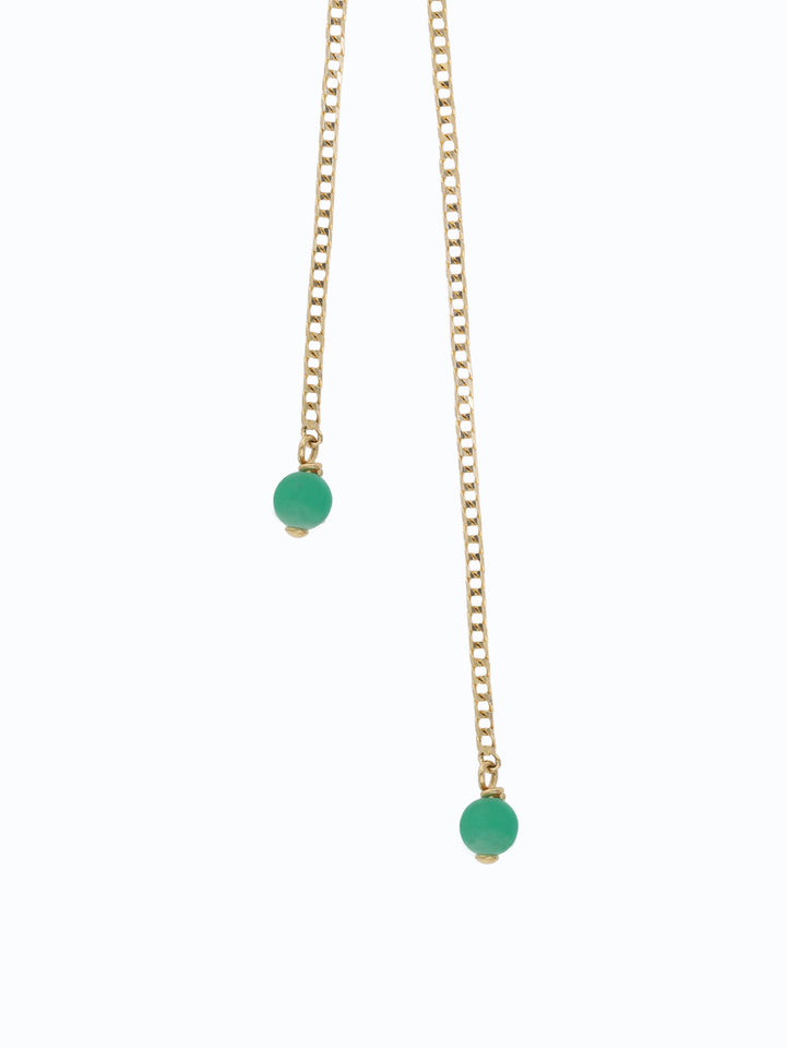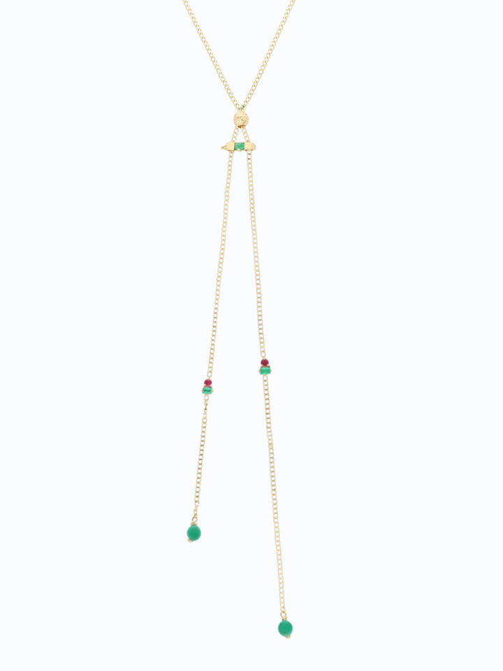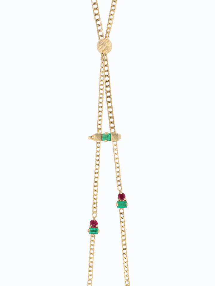 "Esta cadena corbatín en oro 18k, tejida en pancer diamantado, simboliza el movimiento y la dirección consciente. En el vértice central, una esmeralda en corte cuadrado representa la claridad mental y la estabilidad del número 4, mientras que los rubíes y esmeraldas distribuidos en su caída equilibran pasión y serenidad, invitando a avanzar con propósito. Las esmeraldas en balín que culminan el diseño son un recordatorio de que cada paso tiene un destino luminoso. Una joya creada para mujeres que caminan firmes hacia lo que aman."
