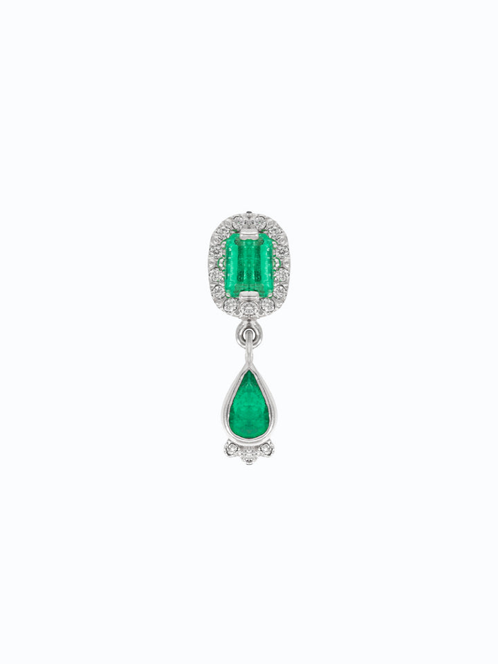 "Dos formas, una energía: la esmeralda rectangular representa la mente clara y la estructura; la gota, el fluir del corazón. Entre ambas, la luz de 17 diamantes, número que vibra con la renovación espiritual y la fuerza interior. Este dije, tallado en oro blanco 18K, guarda la sabiduría de la tierra y la pureza del cielo. Una creación que honra el equilibrio entre razón y emoción, diseñada para quien busca armonía, propósito y elegancia atemporal."