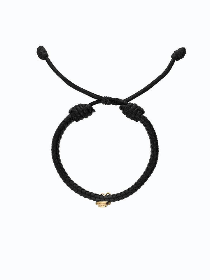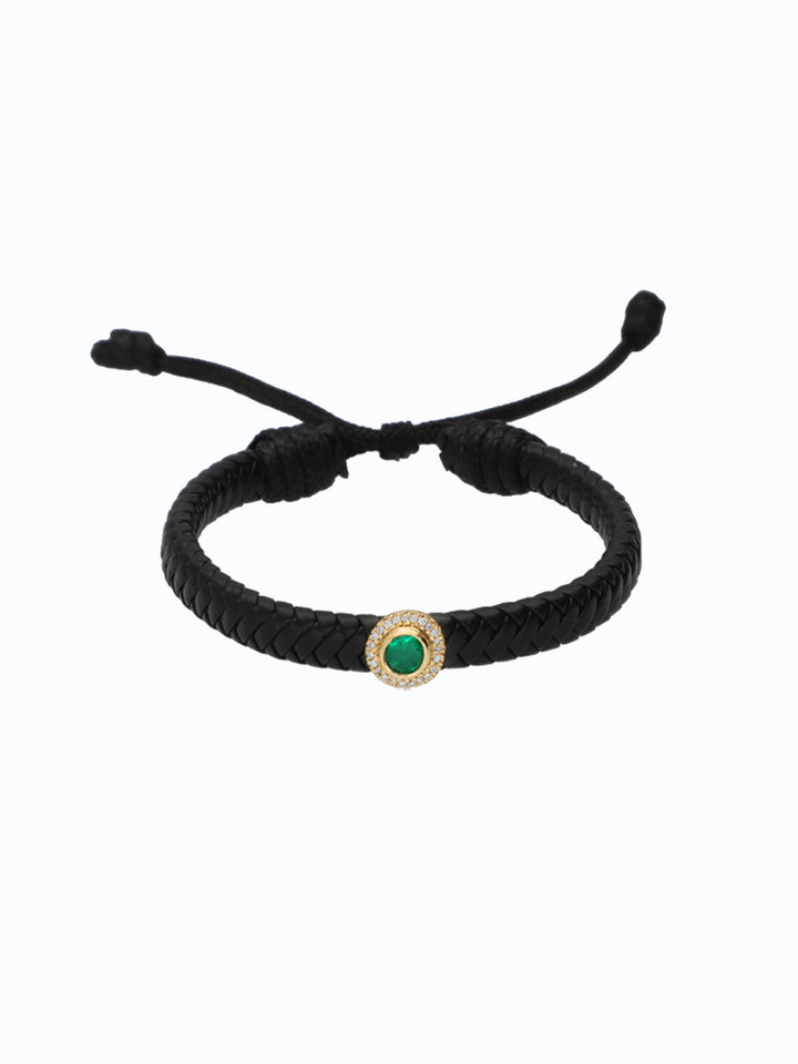 "Esta pulsera de cuero artesanal tejido a mano une la fuerza terrenal con la elegancia del oro 18k. En el centro, una esmeralda redonda simboliza la verdad interior y el poder personal, rodeada por 24 diamantes, número asociado con la protección, la abundancia y el equilibrio energético."