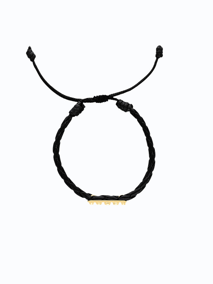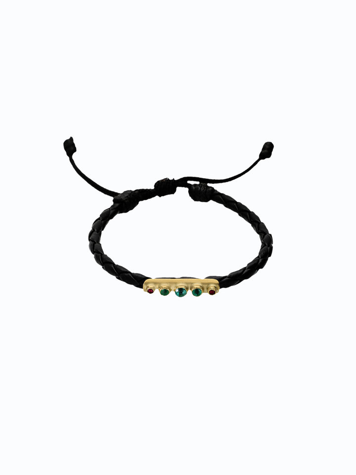 "Esta pulsera de cuero artesanal y detalles en oro 18k integra la energía espiritual de la esmeralda con la fuerza vibrante del rubí. Las tres esmeraldas redondas simbolizan la trilogía sagrada del ser mente, cuerpo y espíritu, mientras que los dos rubíes representan la pasión y la protección, equilibrio perfecto del número 5, asociado con libertad, movimiento y transformación."