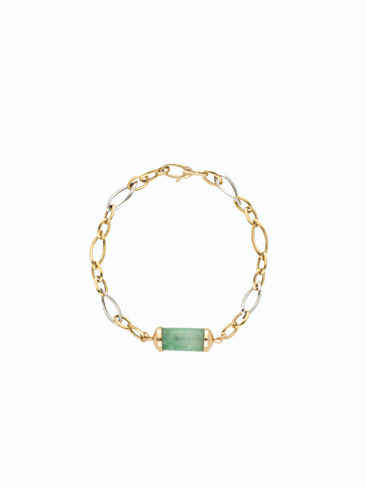"Pulsera de autor en oro 18K con eslabones entrelazados y una esmeralda canutillo central. Su diseño simboliza unión, dirección clara y energía en movimiento. Creada a mano con precisión y esencia."